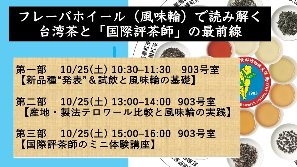 10/25(土)<全三部参加/特別割引・受講証明付>【フレーバホイール(風味輪)で読み解く、台湾茶と「国際評茶師」の最前線】<台湾茶業改良場と中華茶講師協会の特別企画@世界お茶まつり2025>